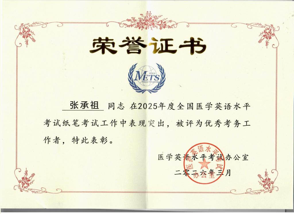 在近日召开的医学英语水平考试 2026 年上半年工作会议上,我校载誉而归,荣获“2025年度全国医学英语水平考试纸笔考试优秀考点”称号,张承祖同志获评“2025年度优秀考务工作者”称号。