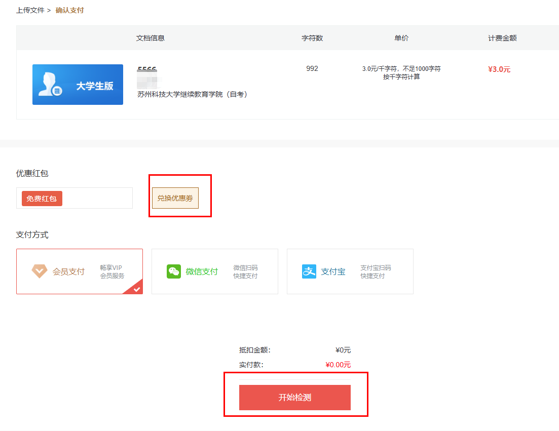 点击去查重,跳转到查重界面,点击兑换优惠券选择免费红包(仅能使用一次),点击开始检测,等待完成检测即可。如果查重结果超过30%需要修改论文重新上传检测(自费)。