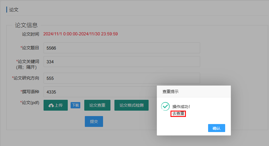 1.查重时间为2025年10月27日-11月30日。确认要在12月毕业的学生,请于11月15日之前完成查重,逾期未完成查重,或查重结果不符合要求的不予办理毕业登记。